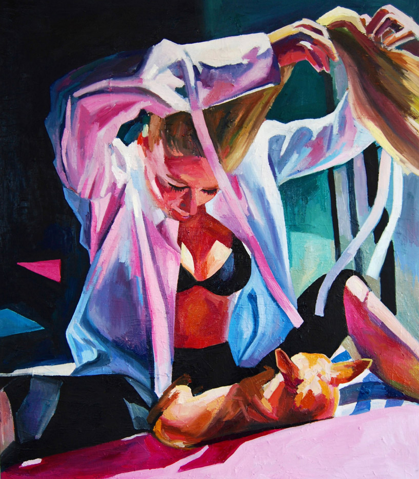 Valentyna Protsak lives and works in Zürich, Switzerland. Her expressionist and figurative paintings are illustrating bodies and characters. She combines strong contrasts in pastel colors to transmit reality as she sees it and reflects her own depiction of visual lifestyle. Her paintings allegorise an encounter with contemporary society and contemporary living.