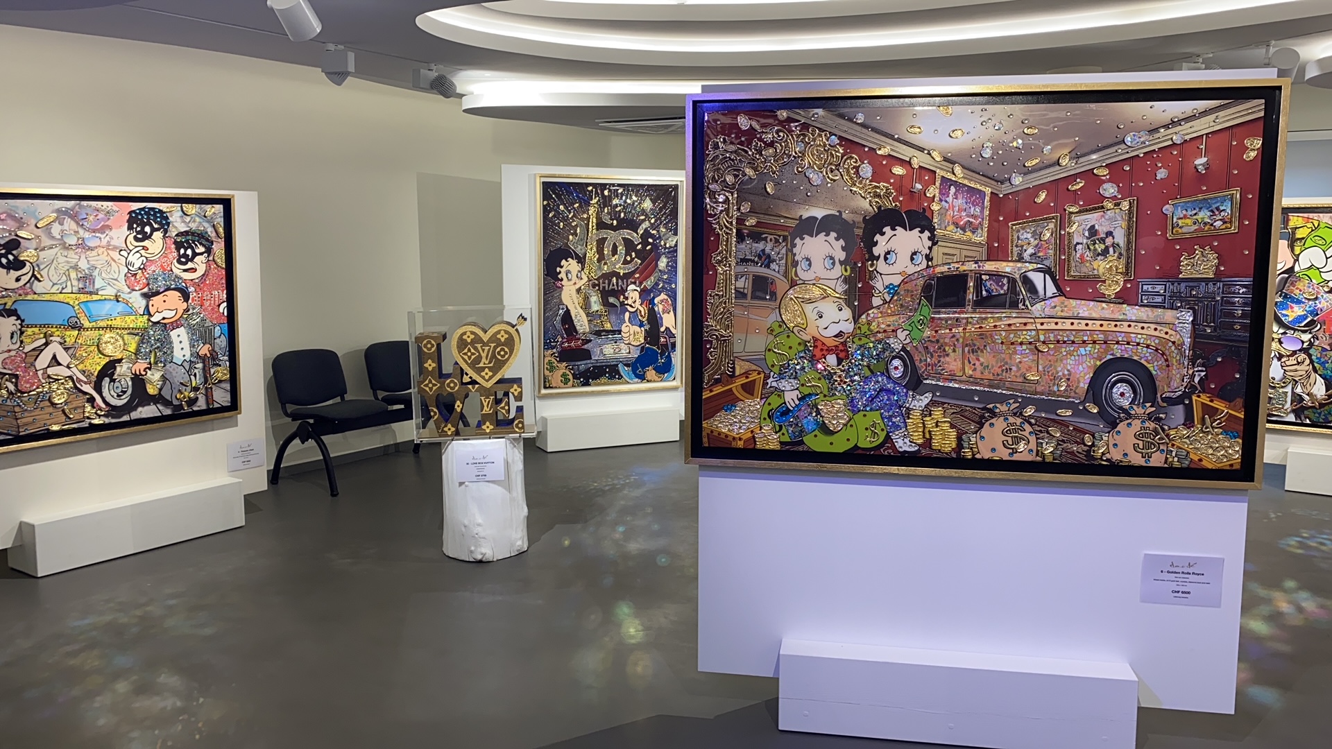 The internationally renowned Artist exhibited in several cities all over the world, enjoying big success and curiosity everywhere thanks to his works studded with gold, colours and precious gems in a unique glitter between luxury and Pop Art.